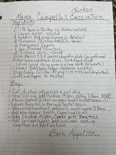 Mama Carapella’s Chicken Cacciatore recipe has been passed down in her family for well over 200 years from Campania, Italy (Southern Region of Naples, the Amalfi Coast), famous for its artistic heritage, agriculture and renowned cuisine – based on all the old family recipes from years and years ago!